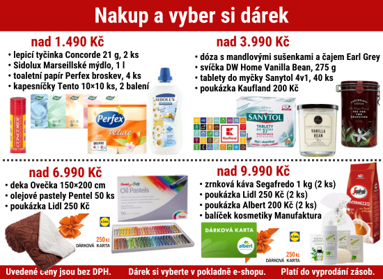 Akce se vztahují na koncové nesmluvní zákazníky. Akce se nevztahuje na zboží z kategorie výpočetní technika a papír v akci. Změna vyhrazena.